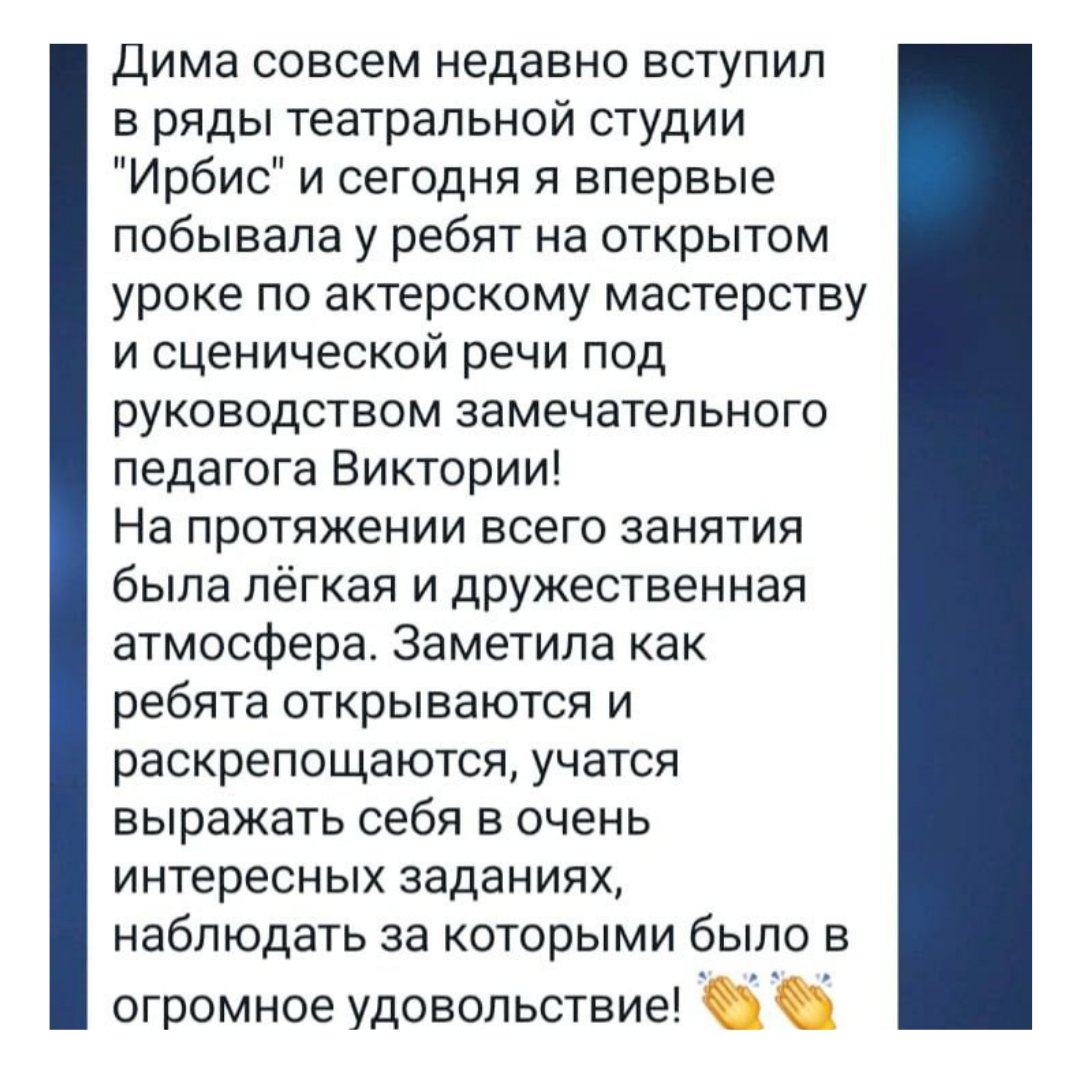 «С трёх лет я тянулась к танцу и театру. Все детство занималась в студиях, и сейчас вспоминаю это время как лучшее в своей жизни. Эти занятия помогли мне сформироваться как личности, поверить в себя и стать профессиональной актрисой театра и кино. Я уверена, что каждый ребёнок может добиться блестящих результатов независимо от его начальных способностей»